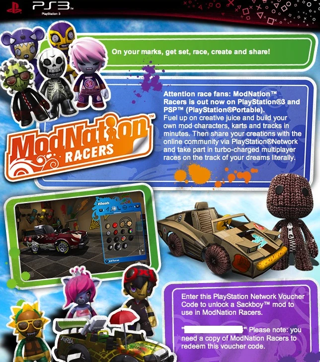 offered to players who pre-ordered or bought the first print of the game, and offered to those who have made previous purchases of DLC for LBP. Users were sent an email with an unlock redeem code unlocking Sackboy and his custom Kart as a playable character.